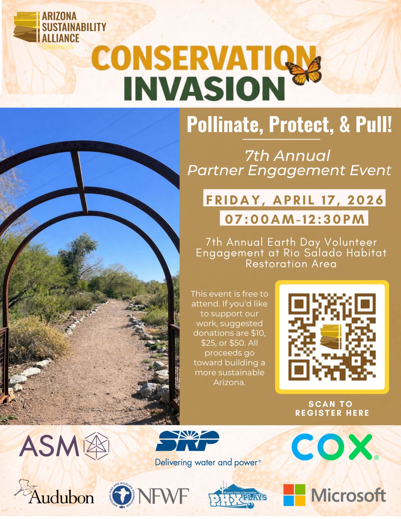 Join Arizona Sustainability Alliance on Friday, April 17th from 7:00 AM – 12:30 PM at the Rio Salado Habitat Restoration Area for a morning of habitat restoration — pulling invasive species, protecting pollinators, and making a real impact on one of Phoenix’s most treasured natural spaces.