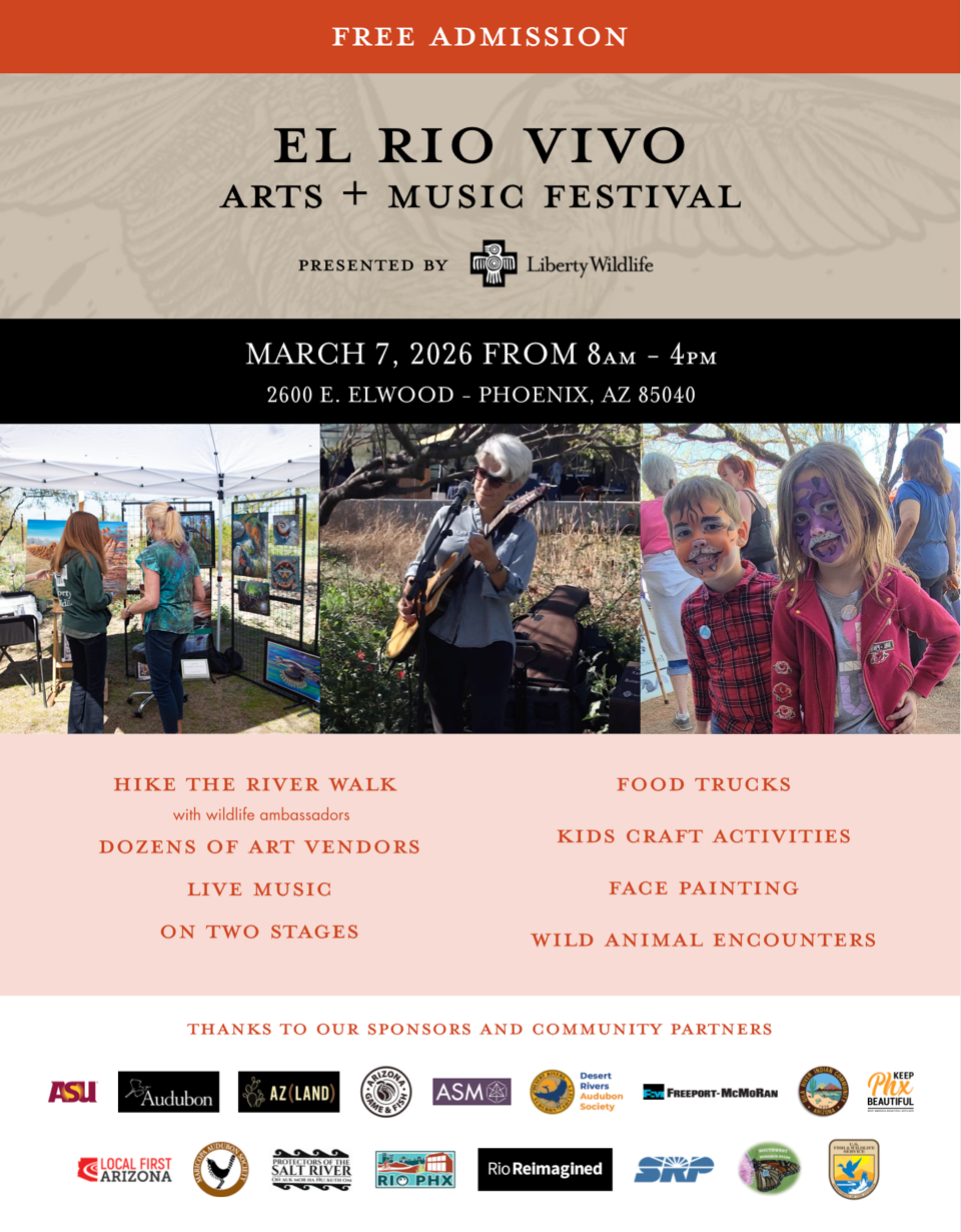 Bring your friends and family to a fantastic annual festival on the banks of the Salt River, hosted by Liberty Wildlife. Live music entertainment on multiple stages, wild animal encounters, river walk, kids crafts, food and more! Mark your calendar and we will see you at El Rio Vivo!
